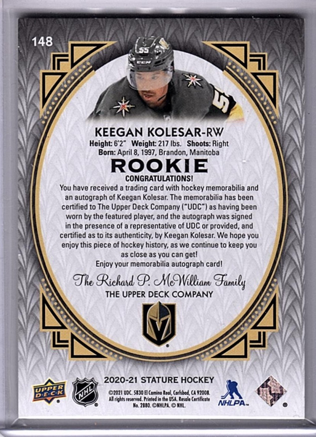 Keegan Kolesar Rookie Patch Auto 32/33 Vegas Golden Knights