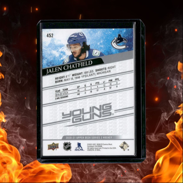 You are purchasing a 2020 Upper Deck Jalen Chatfield Young Guns (A) #452 Rookie. You will receive the exact item in the photographs. Thank you for looking.