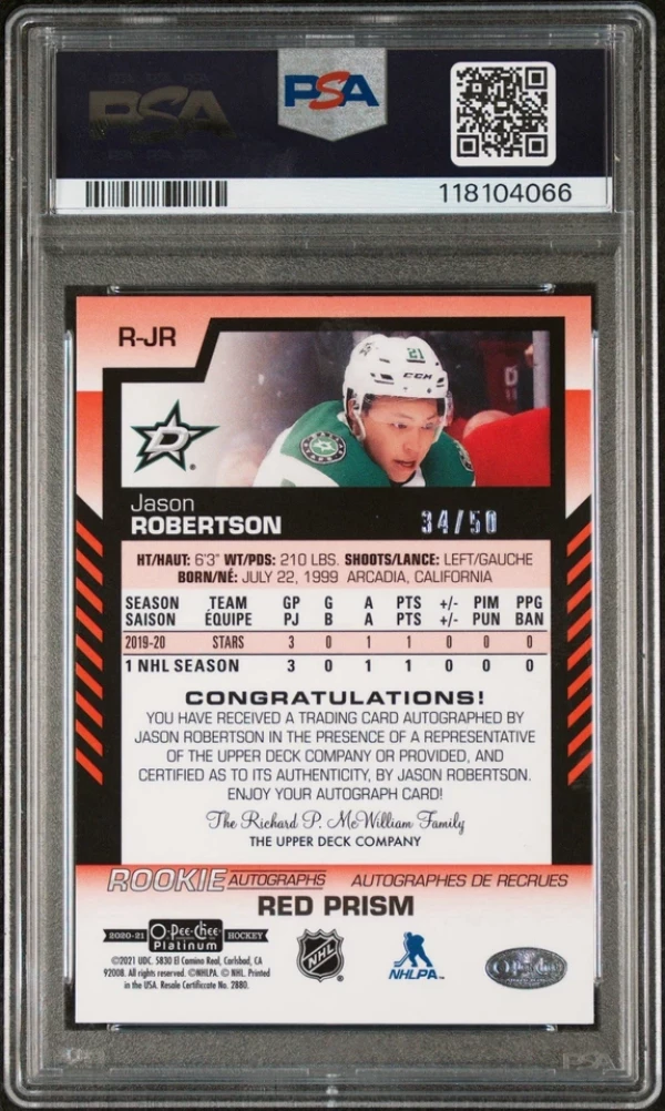 2020-21 Upper Deck OPC Platinum Red Prism Auto /50 Jason Robertson PSA 9