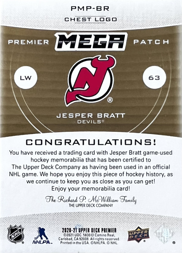 2020-21 Upper Deck Premier Mega Patch /30, Jesper Bratt