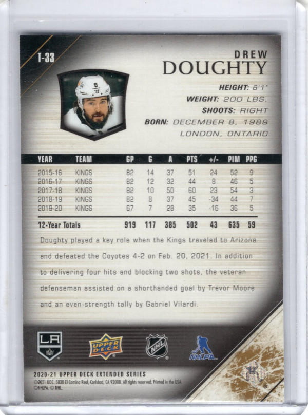 You are purchasing a 2020-21 Upper Deck UD Exclusives Drew Doughty #T-33. You will receive the exact item in the photographs. Thank you for looking.