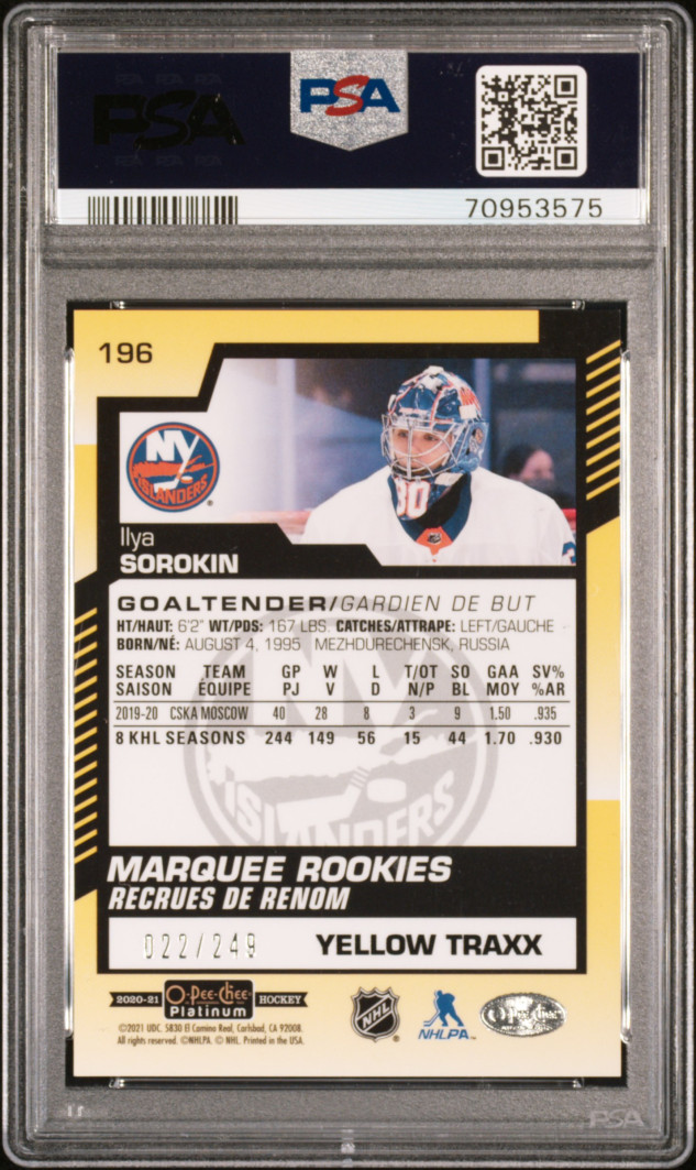 2020 O-Pee-Chee Platinum Ilya Sorokin Yellow Traxx Rookie # 22/249