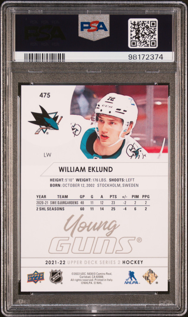 2021-2022 Upper Deck William Eklund Young Guns PSA 9 Mint