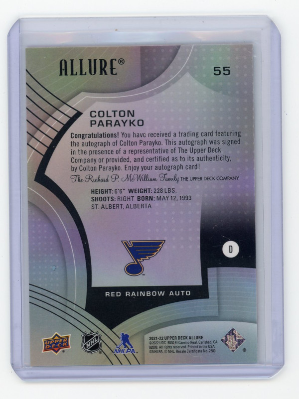 2021-22 Allure #55 Colton Parayko Autograph Red Rainbow