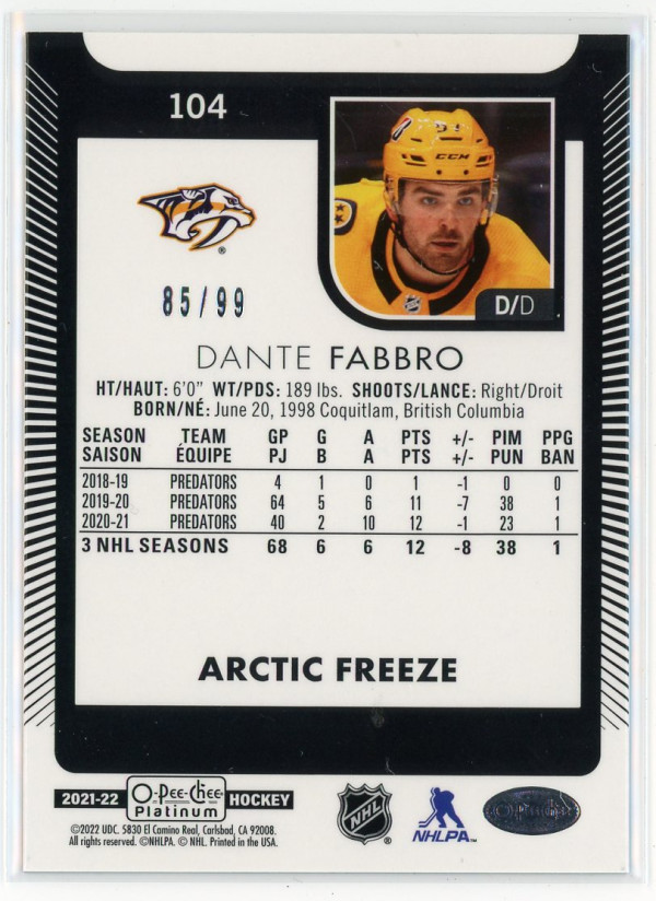 2021-22 O-Pee-Chee Platinum #104 Dante Fabbro Arctic Freeze 85/99