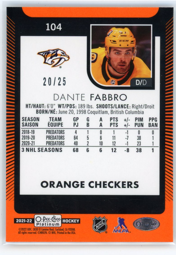 2021-22 O-Pee-Chee Platinum Dante Fabbro Orange Checkers 20/25