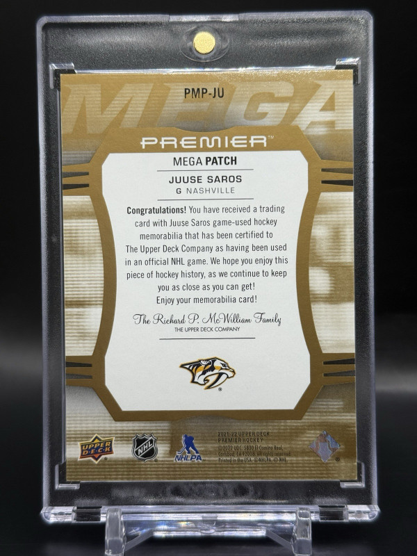 You are purchasing a 2022 2021-22 Upper Deck Premier Juuse Saros Patch Patch Memorabilia. You will receive the exact item in the photographs. Thank you for looking.