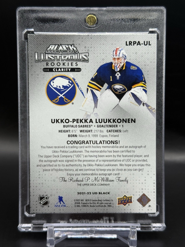 You are purchasing a 2021-22 SPx Ukko-Pekka Luukkonen Patch Rookie. You will receive the exact item in the photographs. Thank you for looking.