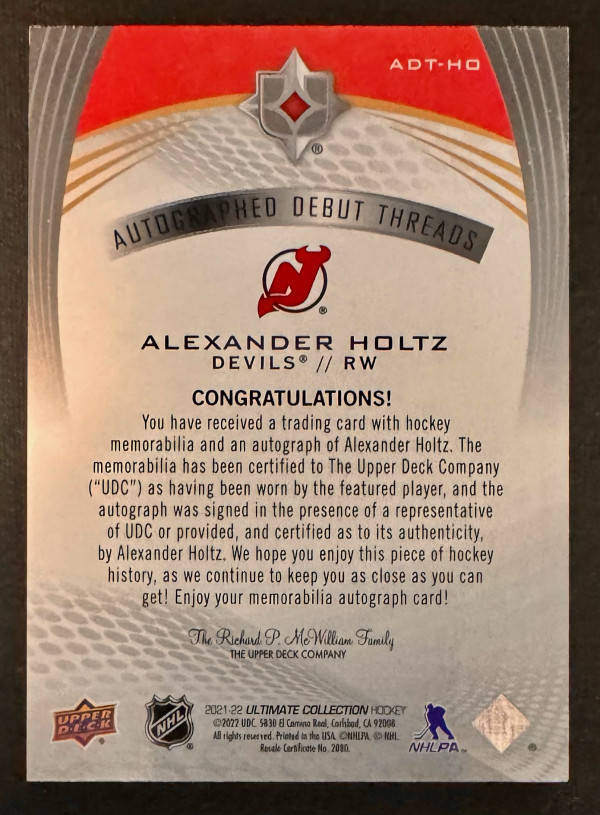 2021-22 Ultimate Collection Alexander Holtz Rookie Patch Auto /99