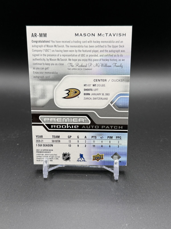2021-22 Upper Deck Premier Mason McTavish Acetate Rookie Patch Auto RC 212/249