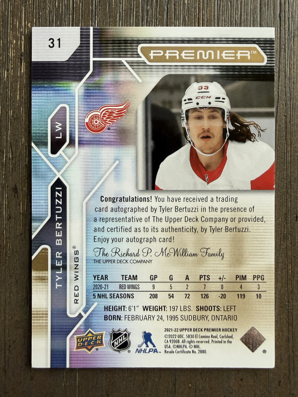 2021-22 Upper Deck Premier Tyler Bertuzzi Base Gold Auto /25 #31