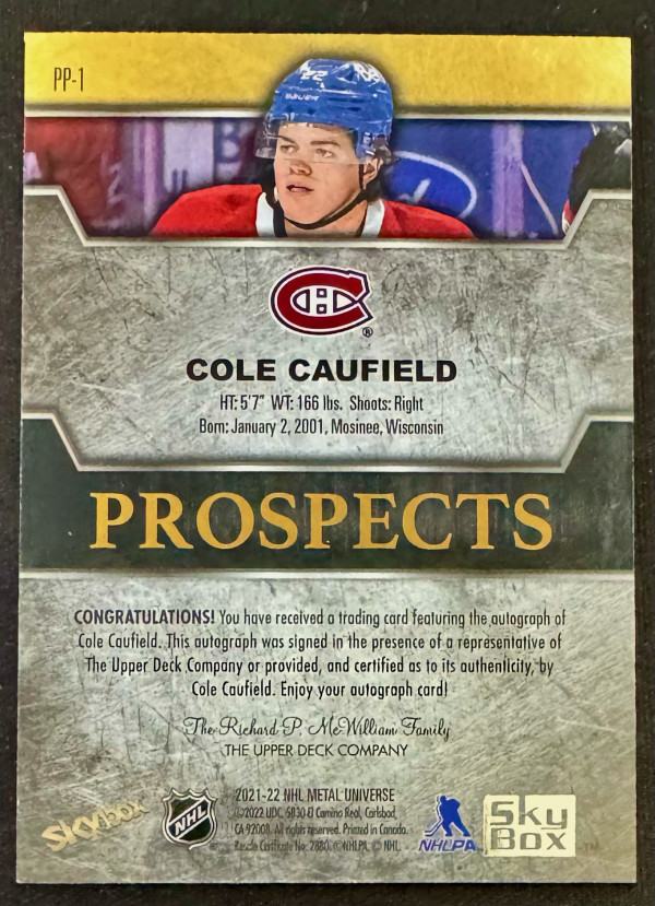 2021 Metal Universe Cole Caufield Skybox Premium Prospects Rookie Auto
