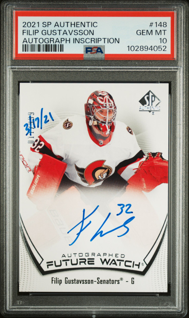 2021 Sp Authentic Hockey - Filip Gustavsson Autographed Future Watch Autograph /999 *** 1st 50 FACTORY INSCRIBED W/ DEBUT DATE ON CARD. PSA GEM MINT 10