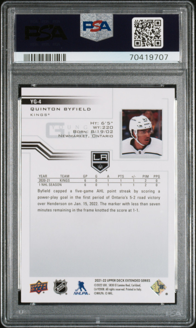 You are purchasing a 2021 Upper Deck 2001-02 Young Guns Retro Quinton Byfield #YG-4 2001-02 Young Guns Retro PSA 8. You will receive the exact card in the photographs. Thank you for looking.