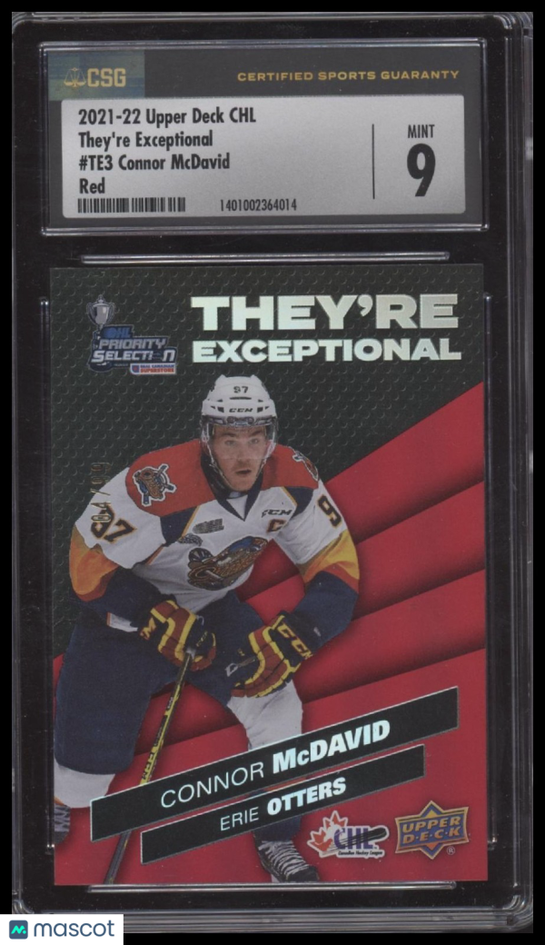 You are purchasing a 2021 CHL Connor McDavid #TE3 They're Exceptional Red #'d /100 CSG 9 Erie Otters / Edmonton Oilers. You will receive the exact item in the photographs. Thank you for looking.