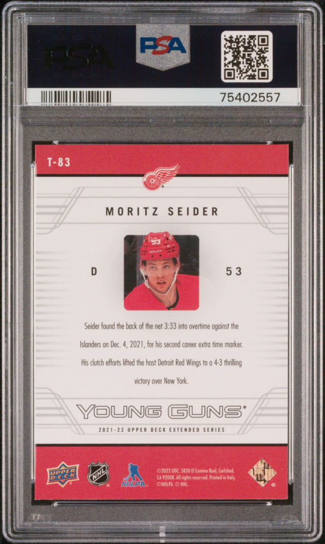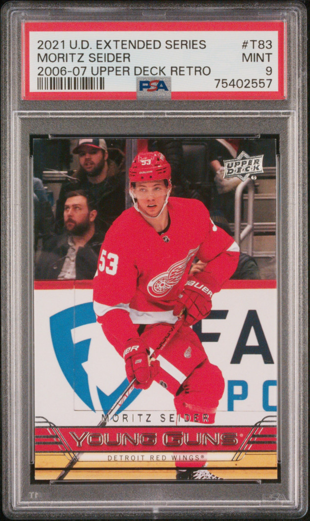 You are purchasing a 2021 Upper Deck Extended Series 2006-07 Upper Deck Retro Moritz Seider #T83 2006-07 Upper Deck Retro PSA 9. You will receive the exact card in the photographs. Thank you for looking. Listed with Mascot.