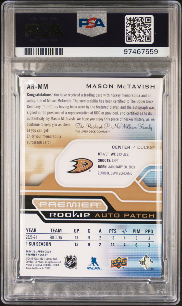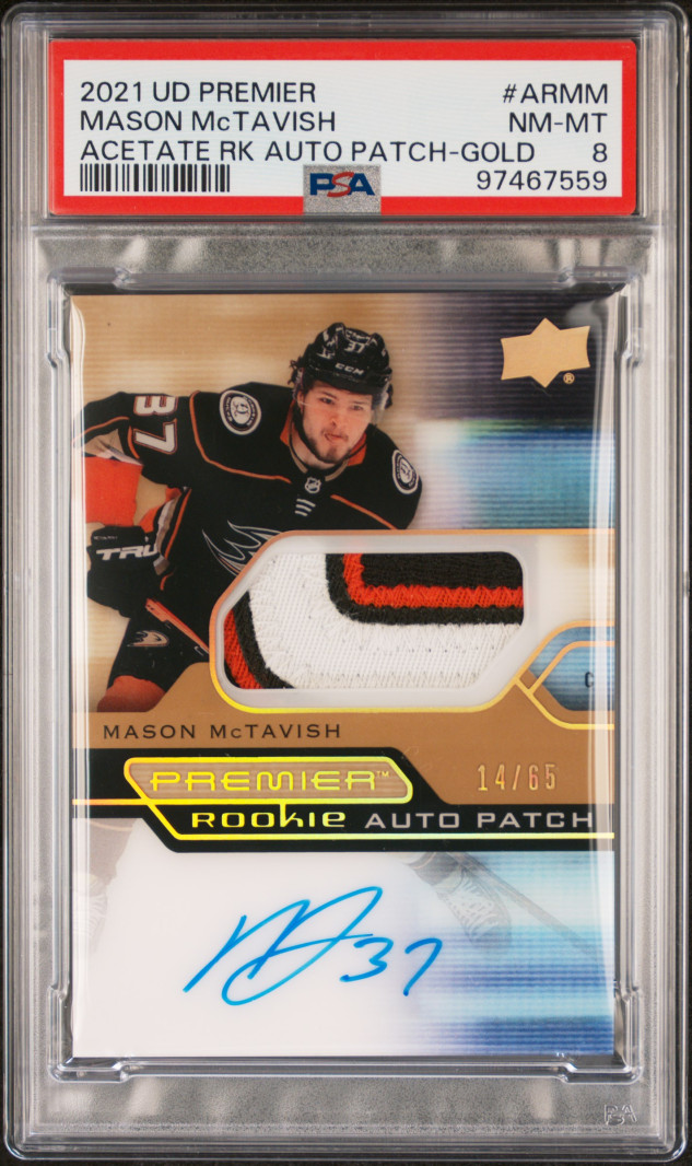 2021 Upper Deck Premier Acetate Rookie Autograph Patch Mason Mctavish Acetate Rk Auto Patch-Gold 14/65 PSA 8