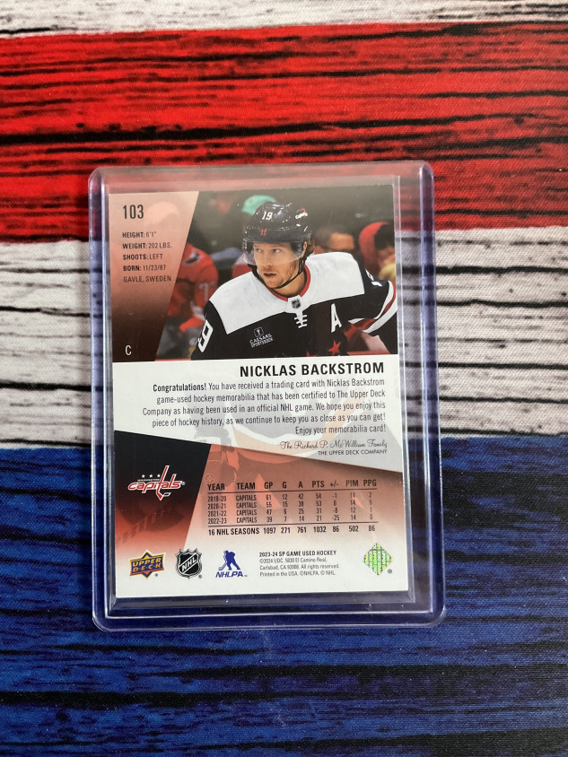You are purchasing a 2021 Upper Deck SP Game Used Nicklas Backstrom #103 Jersey Patch. You will receive the exact item in the photographs. Thank you for looking.