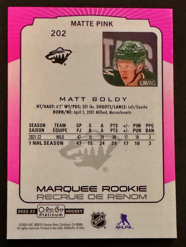2022-23 OPC Platinum Matt Boldy Marquee Rookie Matte Pink