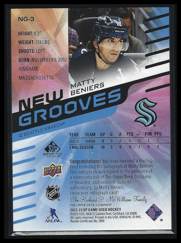 2022-23 SP Game Used Matty Beniers Rookie Auto