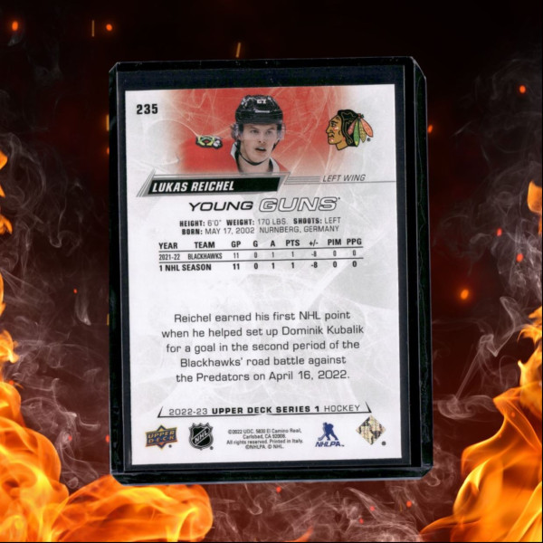 You are purchasing a 2022 Upper Deck Lukas Reichel Young Guns #235 Rookie. You will receive the exact item in the photographs. Thank you for looking.