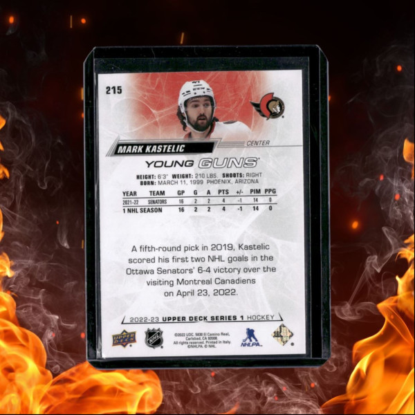 You are purchasing a 2022 Upper Deck Mark Kastelic Young Guns #215 Rookie. You will receive the exact item in the photographs. Thank you for looking.