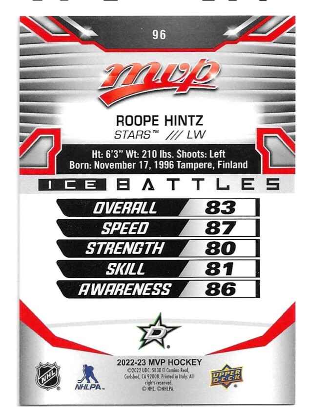 2022-23 UPPER DECK MVP ICE BATTLES #96 ROOPE HINTZ