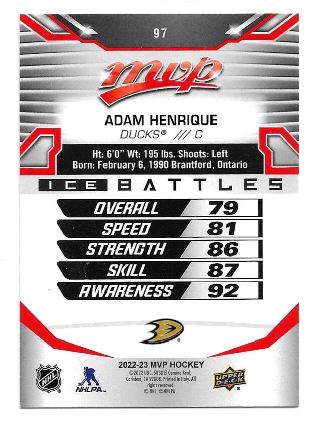 2022-23 UPPER DECK MVP ICE BATTLES #97 ADAM HENRIQUE