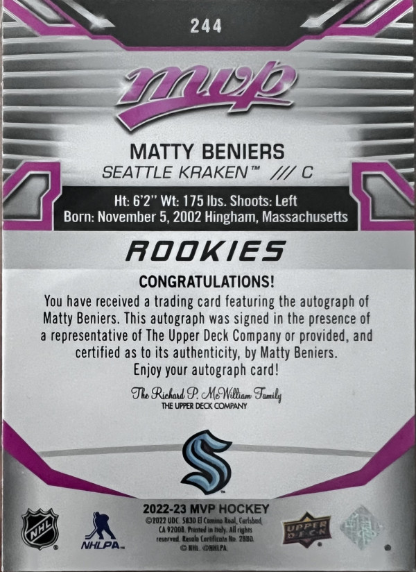 2022-23 Upper Deck MVP Rookies Magenta Autograph, Matty Beniers