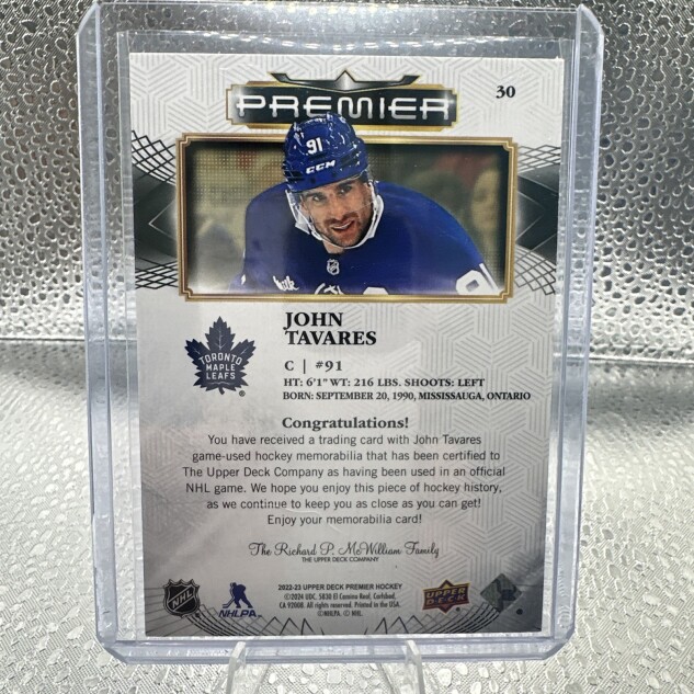 You are purchasing a 2022-23 Upper Deck Premier John Tavares #30 Jersey MEM. You will receive the exact item in the photographs. Thank you for looking.