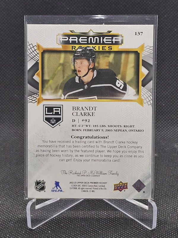 2022-23 Upper Deck Premier Jerseys #137 Brandt Clarke RC