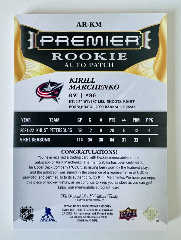 2022-23 Upper Deck Premier RPA Kirill Marchenko /249