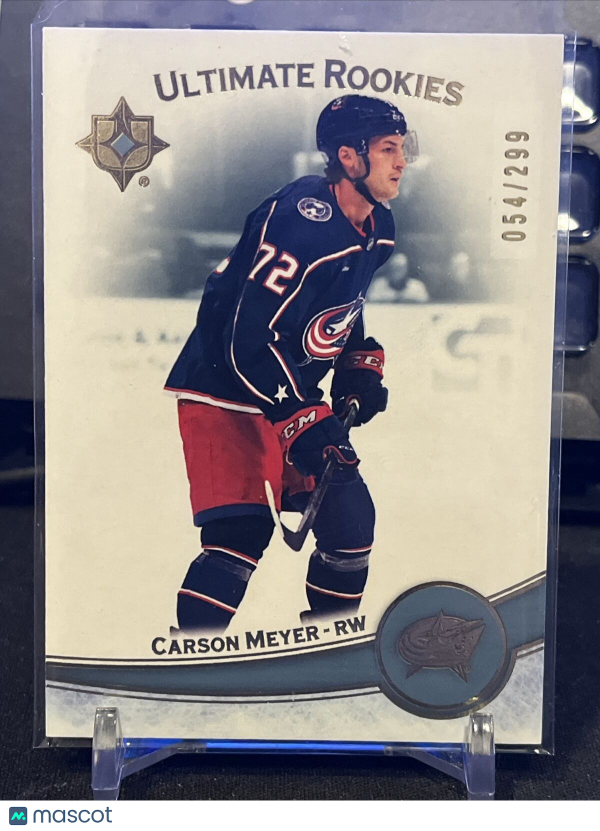 This 2022-23 Upper Deck Ultimate Collection sports trading card features rookie Carson Meyer of the Columbus Blue Jackets. The card is made of high-quality card stock and is part of the Ultimate Rookies insert set. It is #128 of the set, and is serial numbered 054/299.