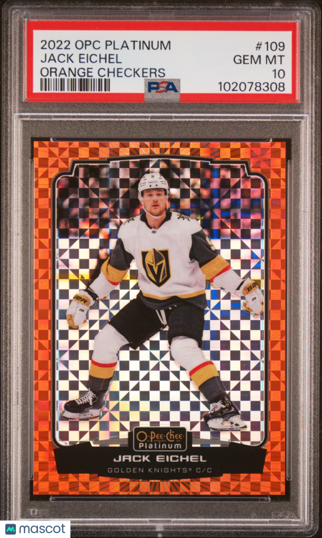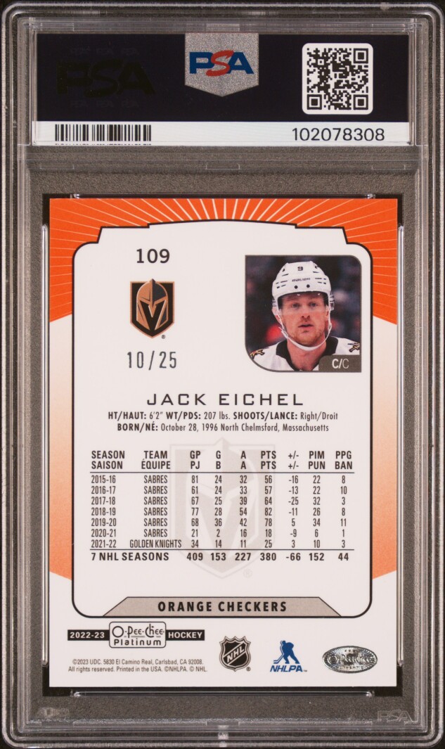You are purchasing a 2022 O-Pee-Chee Platinum Jack Eichel Orange Checkers 10/25 PSA 10. You will receive the exact item in the photographs. Thank you for looking.