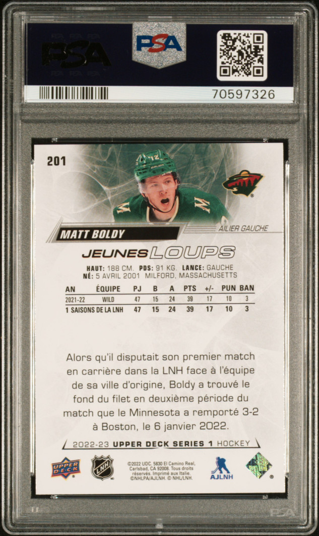 You are purchasing a 2022 Upper Deck Matt Boldy #201 French PSA 9. You will receive the exact card in the photographs. Thank you for looking.