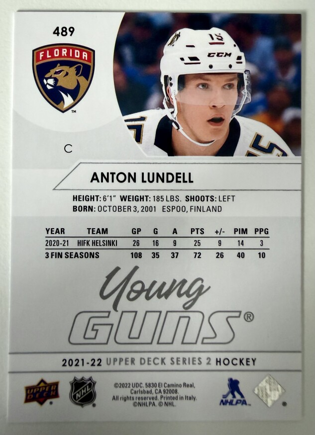 You are purchasing a 2022 Upper Deck Series 2 Young Guns Anton Lundell Rookie. You will receive the exact item in the photographs. Thank you for looking.