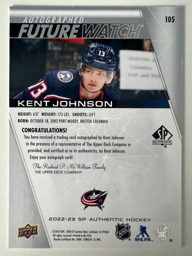 You are purchasing a 2022 Upper Deck SP Authentic Future Watch Auto Kent Johnson /999 Rookie. You will receive the exact item in the photographs. Thank you for looking.