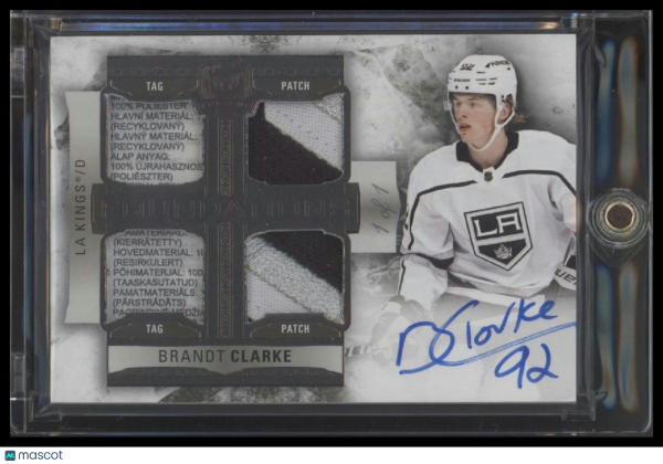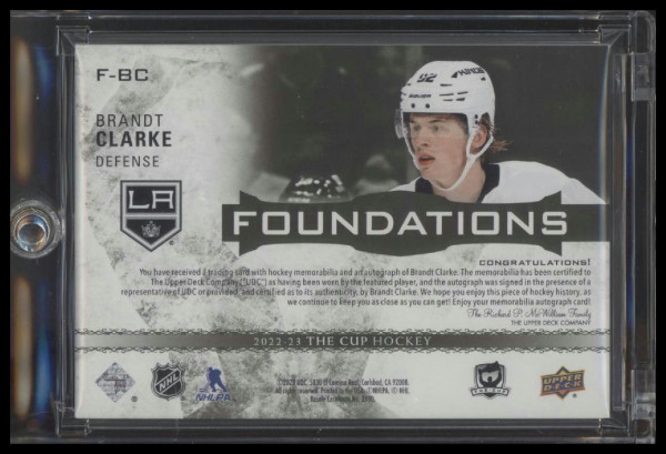You are purchasing a 2022 The Cup Brandt Clarke #F-BC 1/1 Rookie Patch Auto Laundry Tag Los Angeles Kings. You will receive the exact item in the photographs. Thank you for looking.