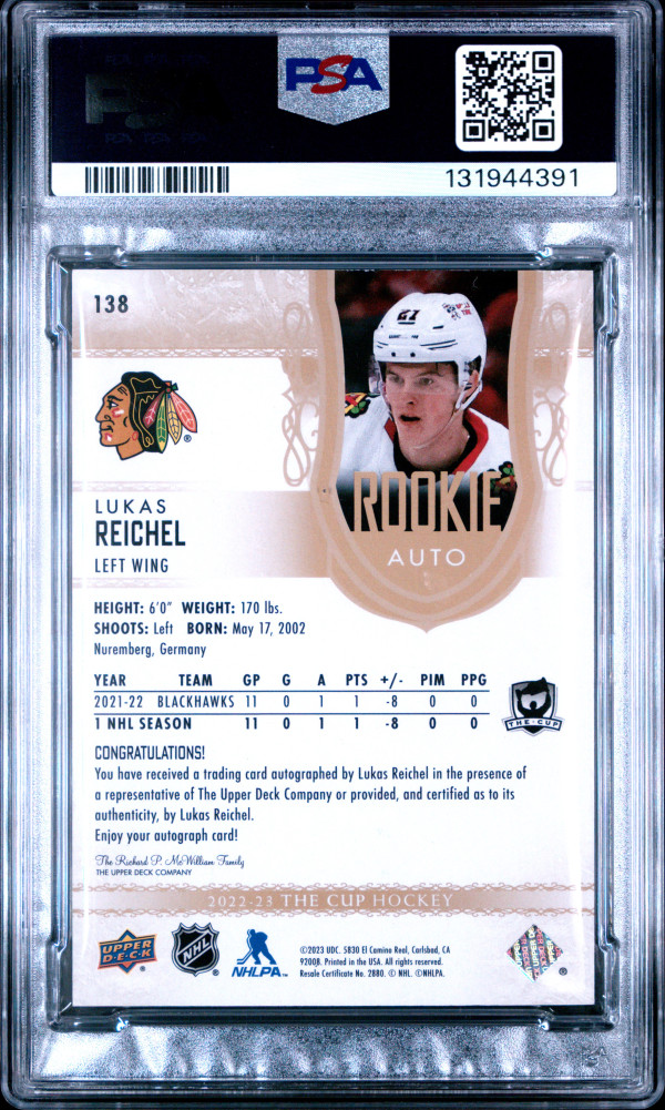 You are purchasing a 2022 Upper Deck The Cup Lukas Reichel #138 Auto Gold Spectrum Foil 24/36 PSA 8. You will receive the exact item in the photographs. Thank you for looking.
