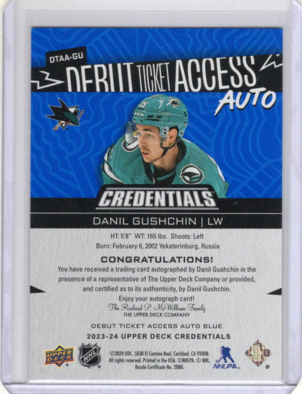2023-24 Debut Ticket Access Auto Blue Rookie /35 Danil Gushchin