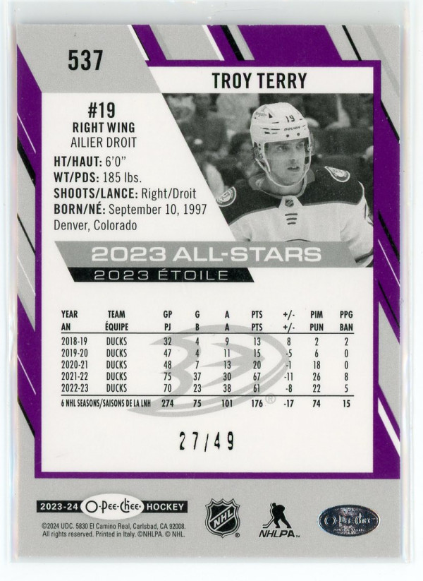 2023-24 O-Pee-Chee #537 Troy Terry All-Stars Purple 27/49