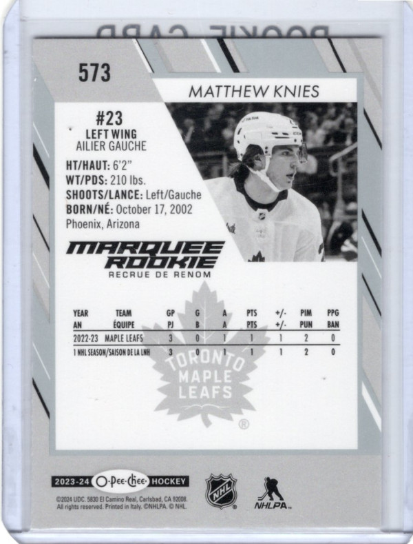 You are purchasing a 2023-24 O-Pee-Chee Marquee Rookie Matthew Knies #573. You will receive the exact item in the photographs. Thank you for looking.