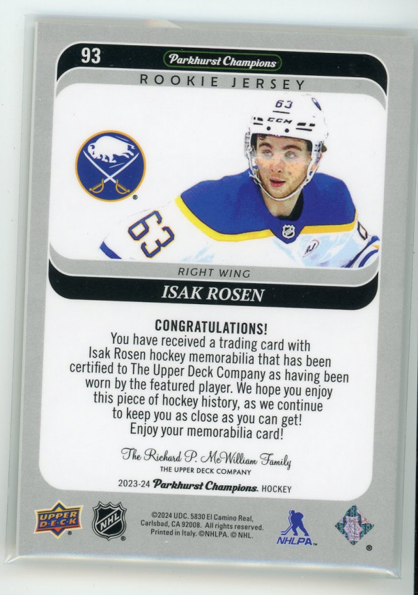 2023-24 Parkhurst Champions Isak Rosen Rookie Jersey #93