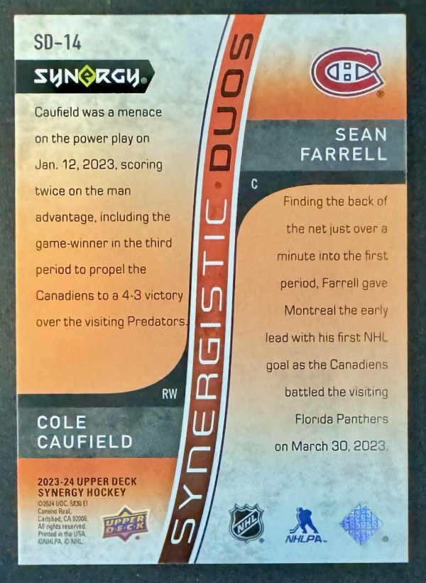 2023-24 Synergy Cole Caufield & Sean Farrell Synergistic Duos /599