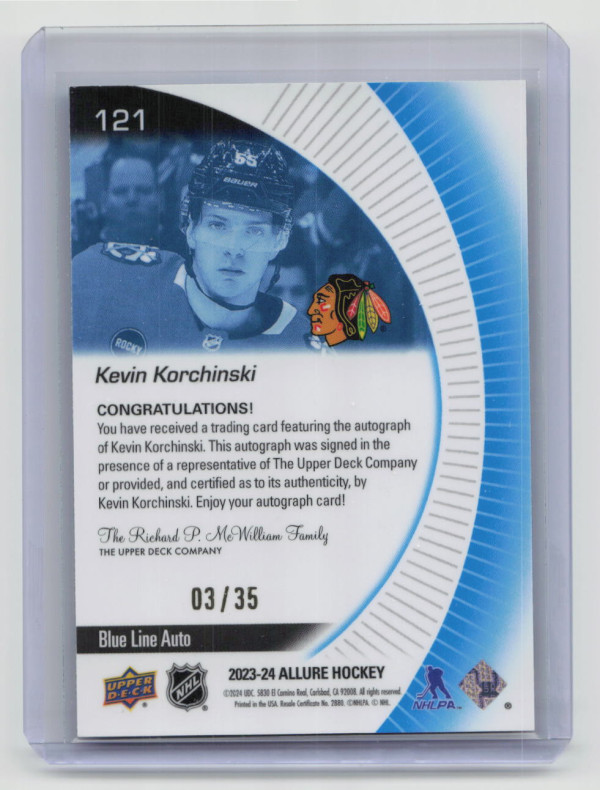You are purchasing a 2023-24 Upper Deck Allure Kevin Korchinski #121 Blue Line Auto Rookie 03/35. You will receive the exact item in the photographs. Thank you for looking.