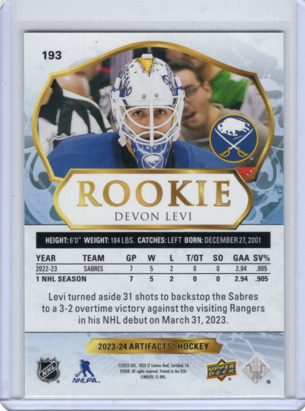 You are purchasing a 2023-24 Upper Deck Artifacts Devon Levi #193 070/199. You will receive the exact item in the photographs. Thank you for looking.