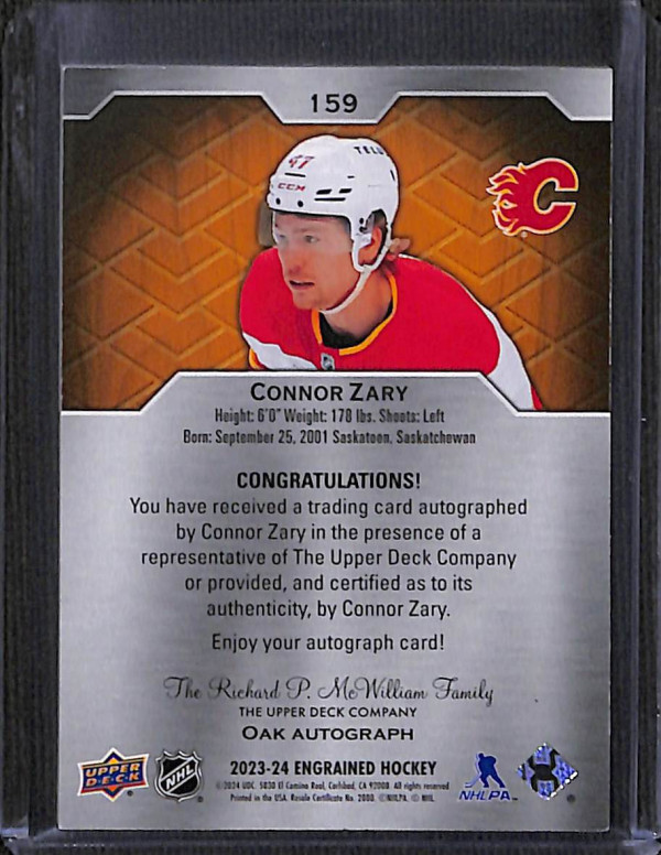 You are purchasing a 2023-24 Upper Deck Engrained Connor Zary #159 Oak Autograph Rookie Autograph. You will receive the exact item in the photographs. Thank you for looking.