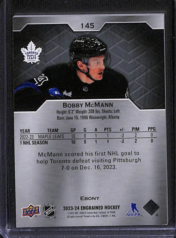 You are purchasing a 2023-24 Upper Deck Engrained Hockey Bobby McMann #145 Ebony Rookie 33/49. You will receive the exact item in the photographs. Thank you for looking.