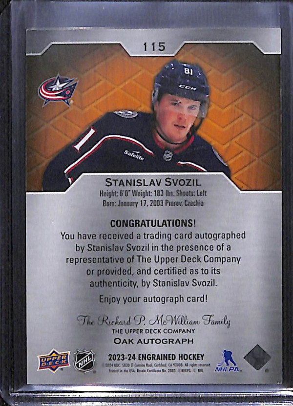 You are purchasing a 2023-24 Upper Deck Engrained Stanislav Svozil #115 Oak Autograph Rookie Autograph. You will receive the exact item in the photographs. Thank you for looking.