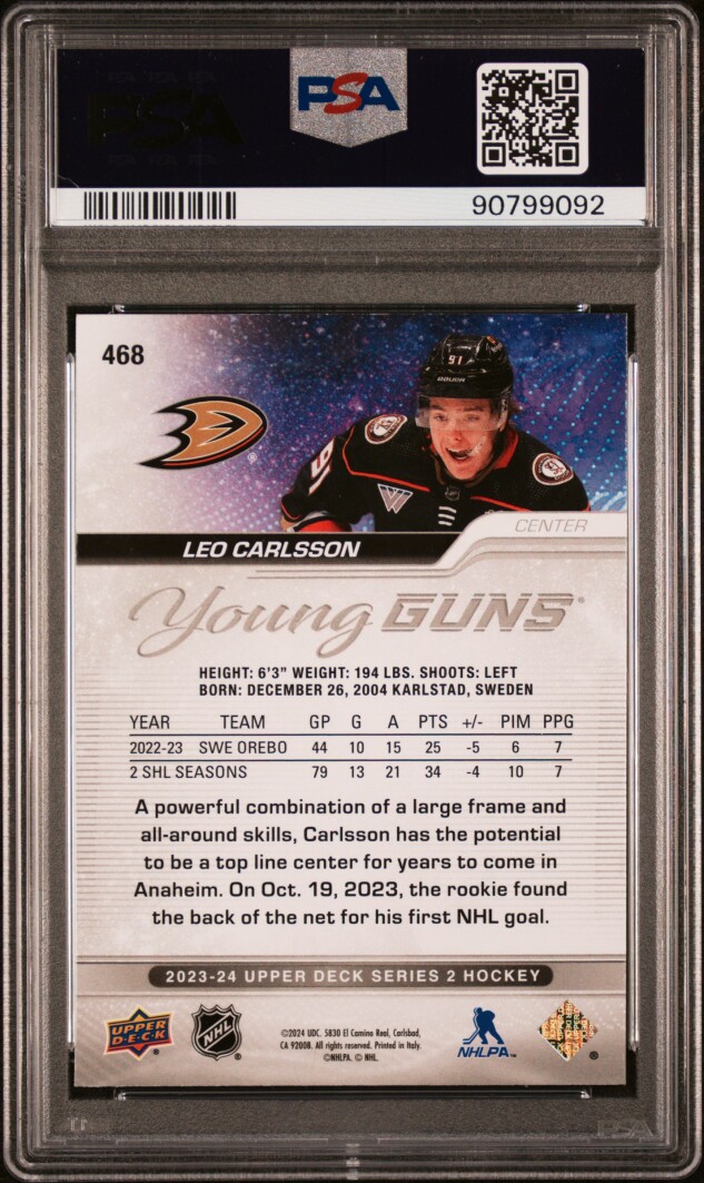 You are purchasing a 2023-24 Upper Deck Leo Carlsson #468 Rookie PSA 10. You will receive the exact item in the photographs. Thank you for looking.